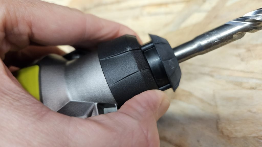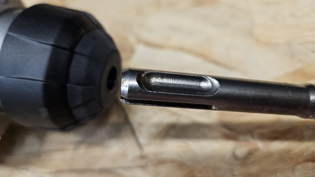 Le mandrin SDS+ facilite les changements de forets : insertion en poussant, retrait en tirant sur la bague. C’est rapide et fiable, idéal quand on enchaîne les trous avec plusieurs diamètres.