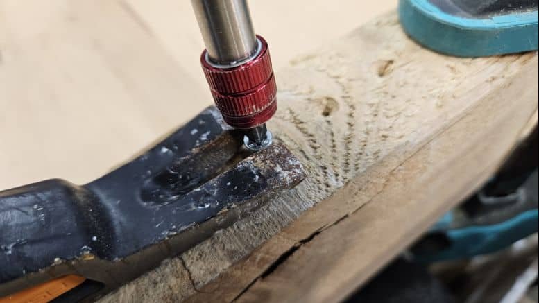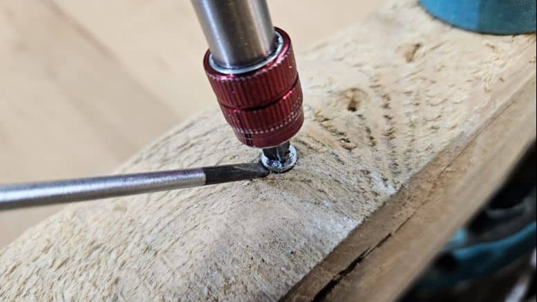 Remettez votre embout en place sur la vis bloquée et tentez à nouveau de la dévisser. Grâce au bois resserré autour d’elle, elle devrait retrouver une accroche suffisante pour pouvoir être extraite.