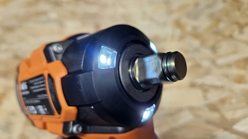 Le format court de cette clé à choc se glisse partout et réduit l’effort au poignet. Le grip est enveloppant, la gâchette est progressive et l’inverseur de sens tombe naturellement sous le pouce. Le frein moteur coupe net en fin de vissage et les 3 LEDs entourant le porte douille éclairent la zone de travail sans ombre marquée, ce qui aide dans les recoins sombres.