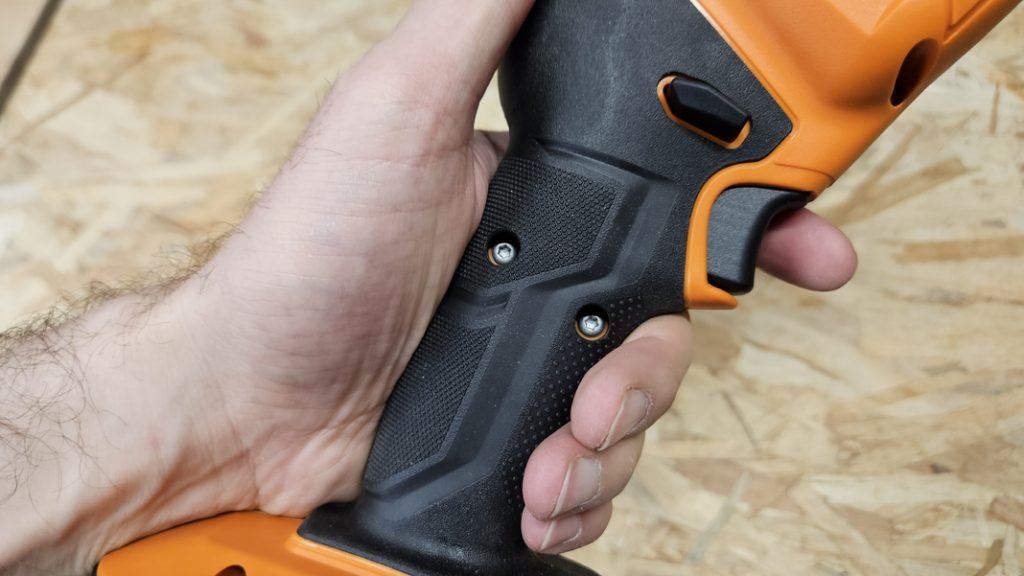 Avec ses 1,76 kg sans batterie, elle n’est pas la plus légère du marché, mais son équilibre et sa conception ergonomique compensent ce poids. La poignée principale recouverte d’un grip antidérapant offre une bonne accroche, tandis que le pommeau avant améliore le maintien à deux mains.
