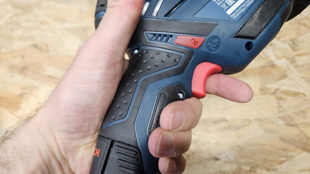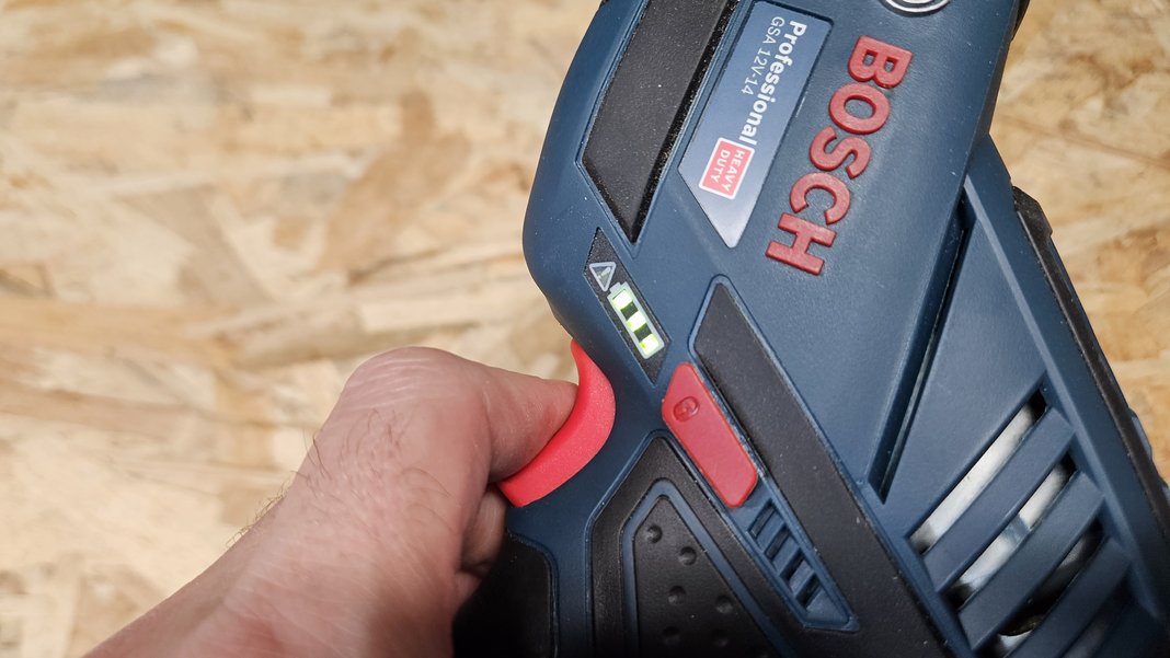 La GSA 12V-14 fonctionne avec les batteries Bosch Pro 12V mais aussi avec les anciennes 10,8V. Une bonne nouvelle pour ceux qui possèdent déjà un parc d’outils de la marque. Comme les accus 12V Bosch ne possèdent pas d’indicateur de charge, sachez que la scie intègre un voyant lumineux de batterie directement sur la machine, visible dès qu’on appuie sur la gâchette.