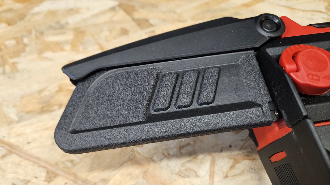 Sous son format compact, cette mini tronçonneuse embarque un moteur Brushless de nouvelle génération. Celui-ci offre un meilleur rendement et une durée de vie supérieure aux moteurs à charbons classiques. La vitesse de chaîne atteint 4,8 m/s, ce qui n’est pas la plus élevée du marché, mais cela reste suffisant pour couper des branches jusqu’à 12 cm de diamètre sans effort. Le moteur quand à lui répond instantanément à la gâchette et s’arrête rapidement à la relâche, améliorant la sécurité et la précision.