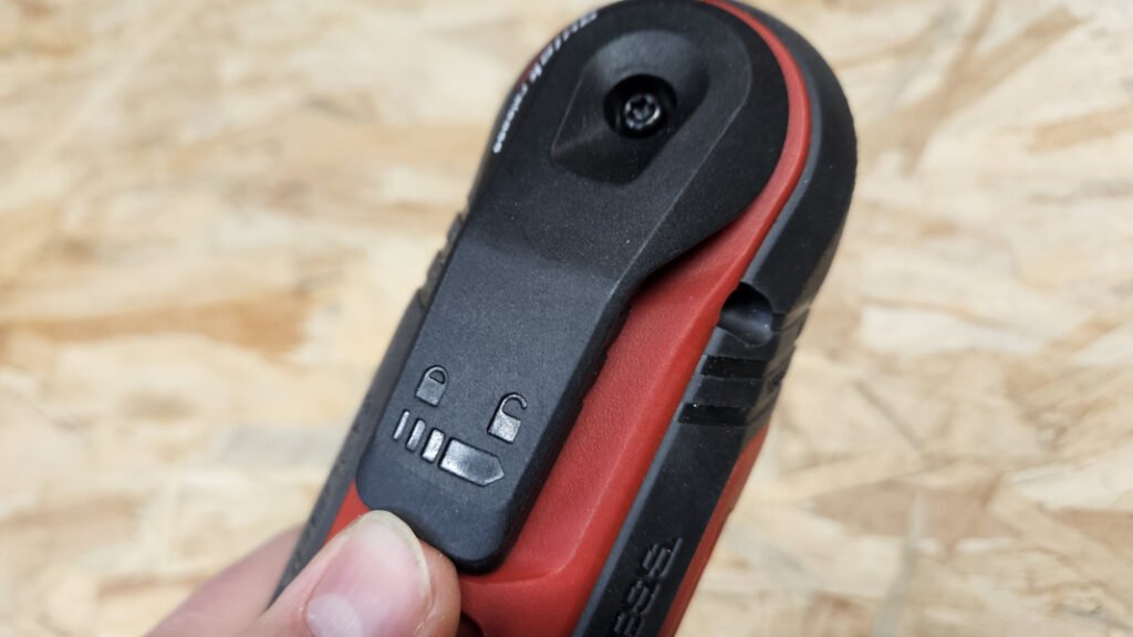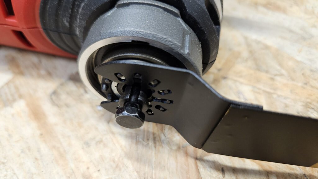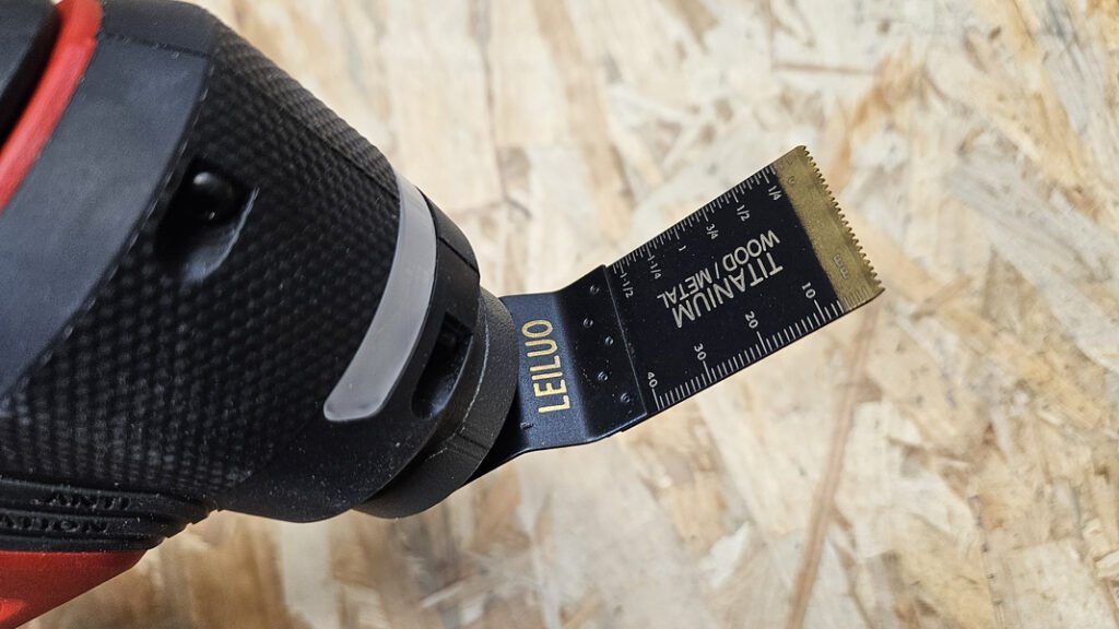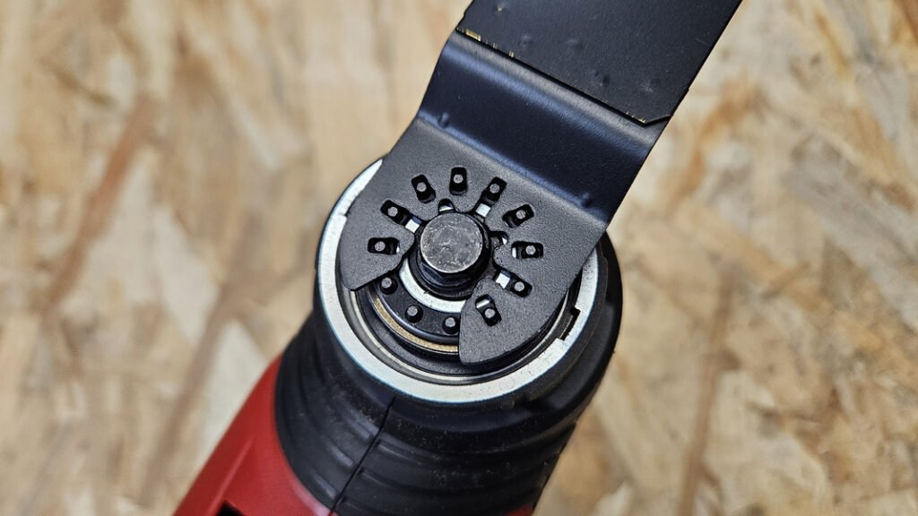 Ici, on est sur un changement sans outil via un levier., qui est un peu raide au début, mais une fois qu’on a pris le coup, c’est rapide. Et surtout, l’outil dispose d’une bague aimantée qui maintient l’accessoire pendant qu’on choisit l’orientation. Ça évite que la lame tombe au sol, et ça facilite énormément le montage quand on n’a pas trois mains.