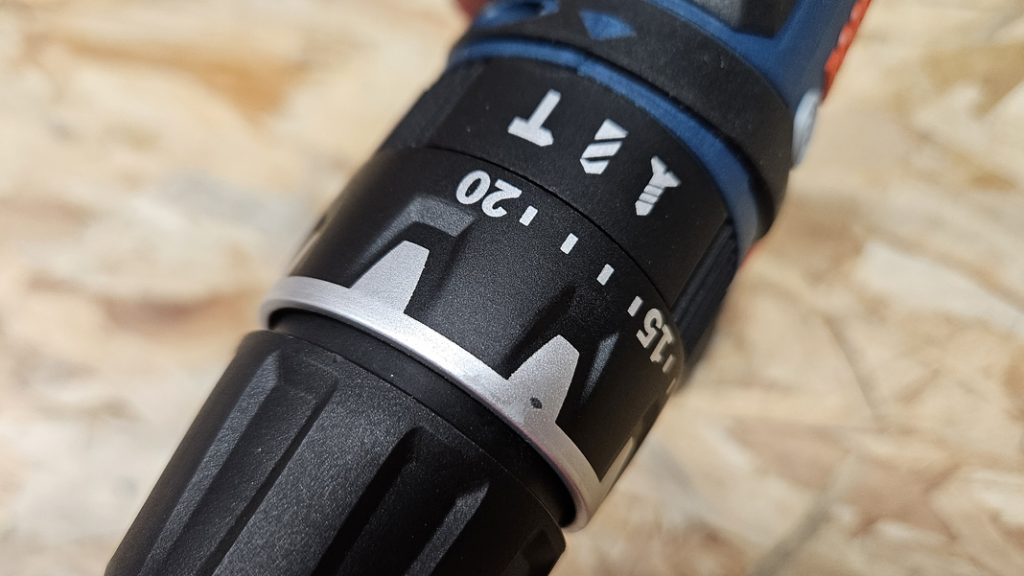 La bague de couple offre 20 positions et une seconde bague bascule entre vissage / perçage / percussion. Ce trio de réglages rend l’outil très lisible et rapide à ajuster.