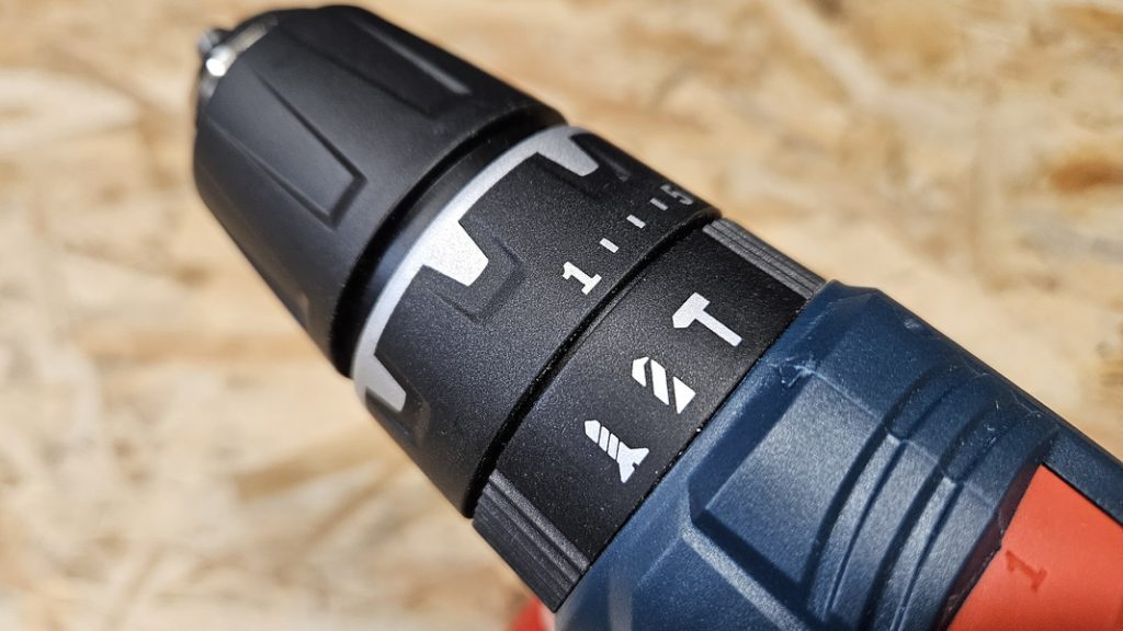 La GSB 18V-21 propose une configuration classique et efficace : deux vitesses mécaniques, une bague de 20 positions de couple pour le vissage, et une seconde bague pour passer du vissage au perçage, puis à la percussion.
