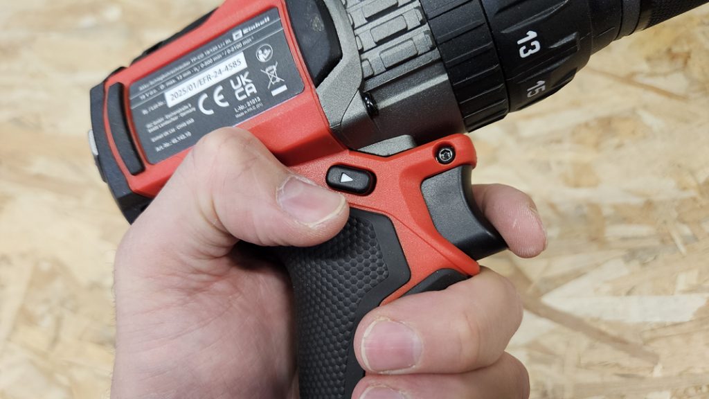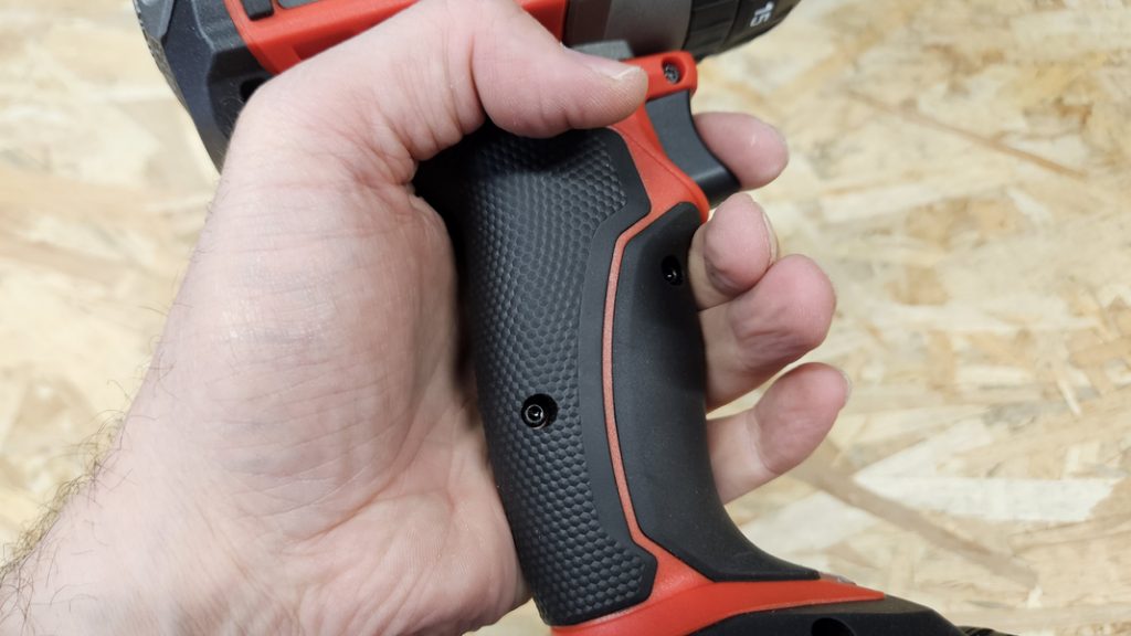 Avec ses 1,54 kg (hors batterie), elle se situe dans la moyenne haute pour une perceuse à percussion, mais ce poids un peu élevé s’explique par sa puissance et son équipement. La poignée est de plus intégralement recouverte de grip antidérapant et la machine est bien équilibrée. Les boutons tombent naturellement sous les doigts, et des renforts en gomme protègent la carcasse en cas de choc.