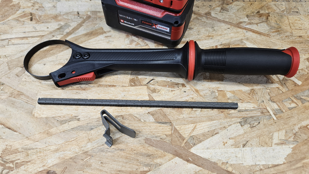 Einhell a soigné l’équipement avec un mandrin 100 % métal (1,5 à 13 mm), une poignée latérale longue pour un meilleur contrôle, une butée de profondeur pour les perçages réguliers, et un clip ceinture. L’ensemble respire la solidité et l’orientation pro.
