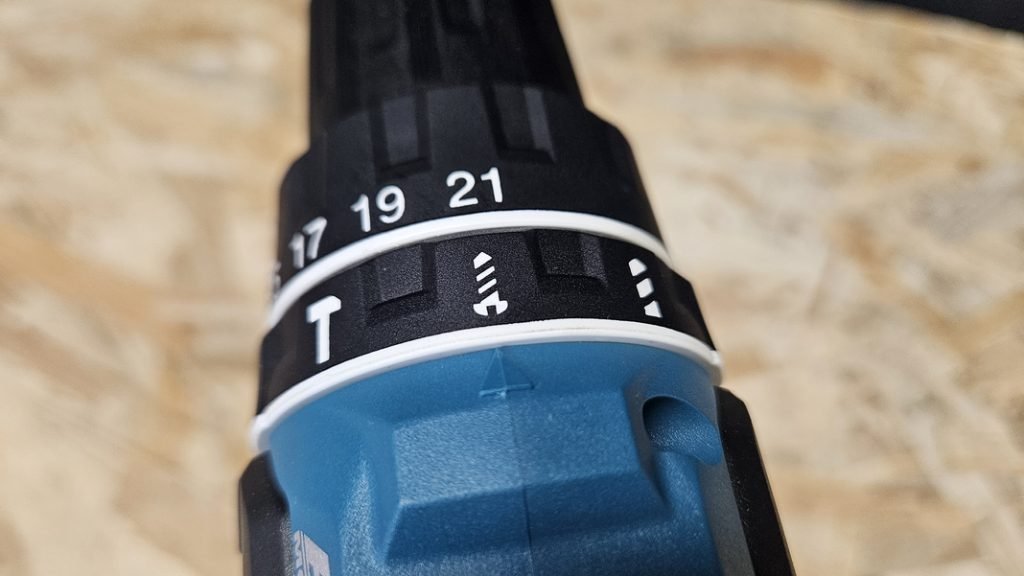 Comme je le mentionnais plus haut, la DHP485Z propose deux vitesses mécaniques, mais aussi une bague de couple avec 21 positions et une seconde bague pour sélectionner le mode de travail : vissage, perçage simple ou percussion.