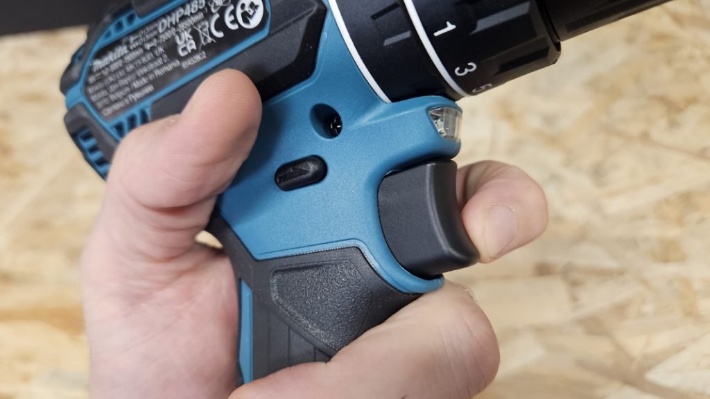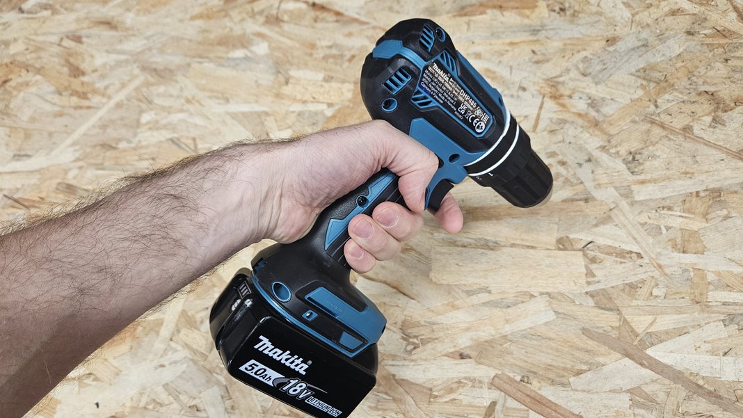 Avec 1,14 kg sans batterie, la DHP485Z reste relativement légère pour une perceuse à percussion. Le grip en caoutchouc recouvre une grande partie de la poignée et assure une bonne tenue, même lors d’un usage prolongé. Les commandes (inverseur de sens, gâchette, bagues de réglage) sont bien placées et réactives.