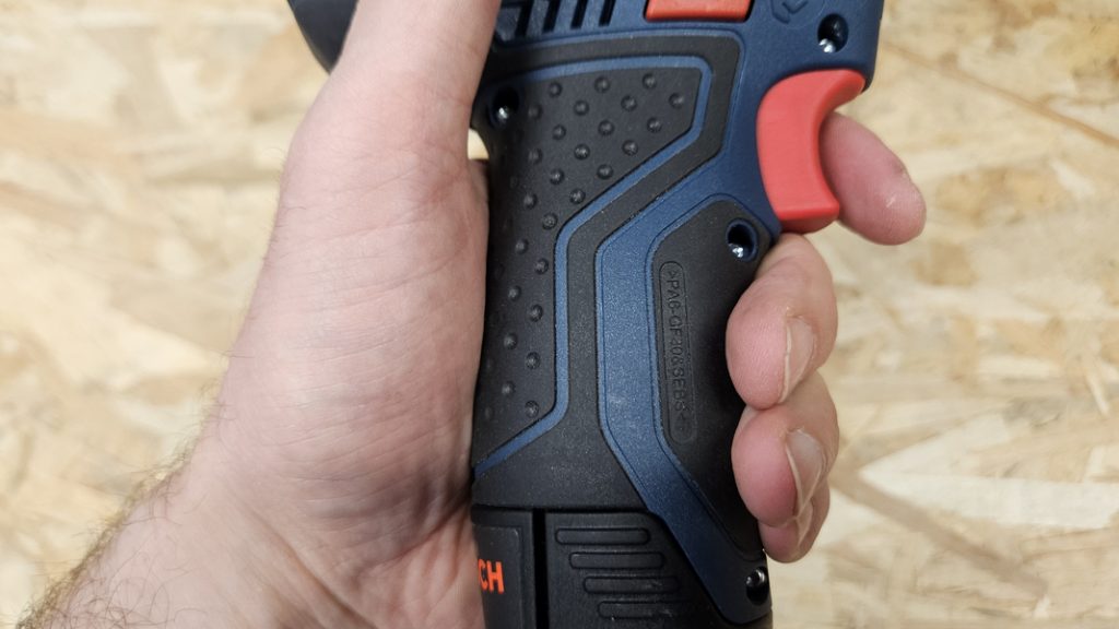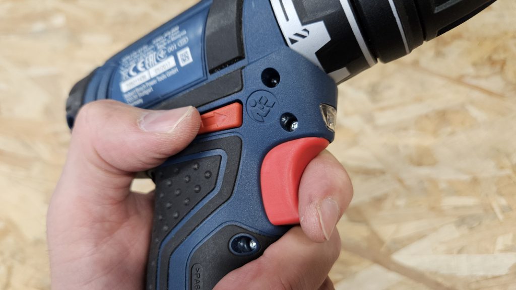 Avec 840g sans batterie, cette perceuse est un modèle de compacité. Son grip caoutchouté recouvre une bonne partie de la zone en contact avec la main pour un meilleur confort. Les commandes sont bien placées et réactives : la gâchette est progressive, l’inverseur de sens tombe naturellement sous le pouce et l’index.