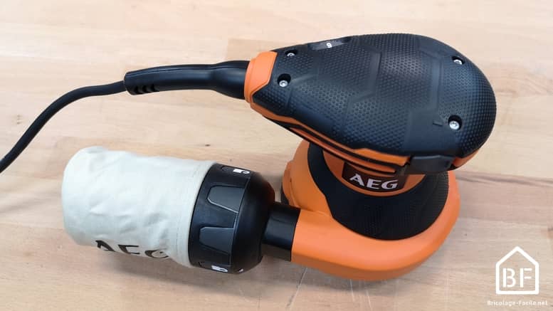 Côte récupération des poussières, cette ponceuse excentrique AEG EX 125 ES est équipée d’un récepteur en tissu, qui va collecter les poussières.