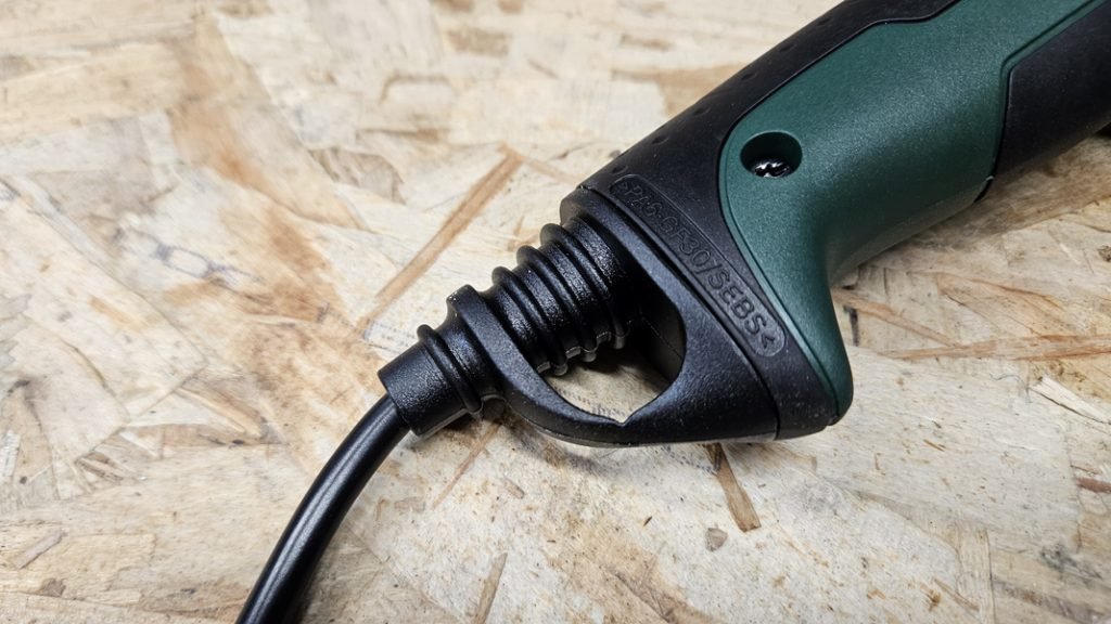 Il s’agit d’un modèle filaire de 230 V qui offre une puissance constante et une autonomie illimitée, à condition d’avoir une prise accessible. Le câble d’environ 2,5 m possède un renfort au point de flexion, une bonne idée pour préserver la durée de vie sur une zone souvent sollicitée. En atelier, cette configuration reste très pertinente et évite la gestion des batteries.