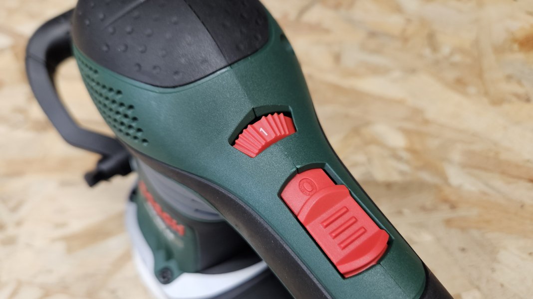 Le moteur de 370 W place la PEX 400 AE dans la catégorie des excentriques polyvalentes. Associée à une orbite de 5 mm, elle enlève rapidement la matière tout en préservant une bonne qualité de surface. Le variateur situé sur le dessus permet d’ajuster la cadence de 4 000 à 26 000 oscillations/min, ce qui aide à adapter l’outil au matériau et au grain de l’abrasif. Le niveau sonore augmente logiquement aux vitesses élevées mais les vibrations restent bien contenues.