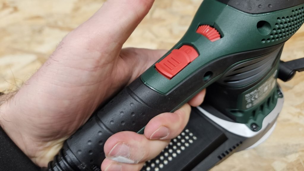Le poids de 1,9 kg apporte de la stabilité sur l’établi, même s’il fatigue davantage en hauteur. Le bouton de verrouillage autorise un fonctionnement continu sans presser la gâchette, pratique quand on travaille au pommeau. L’équilibre général inspire confiance et la visibilité sur la zone de ponçage s’améliore encore si l’on retire la poignée latérale.