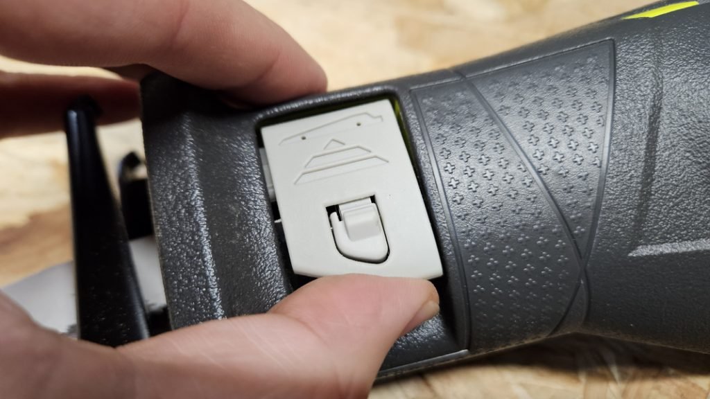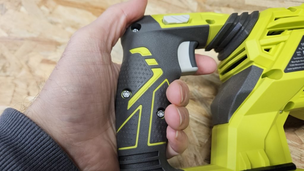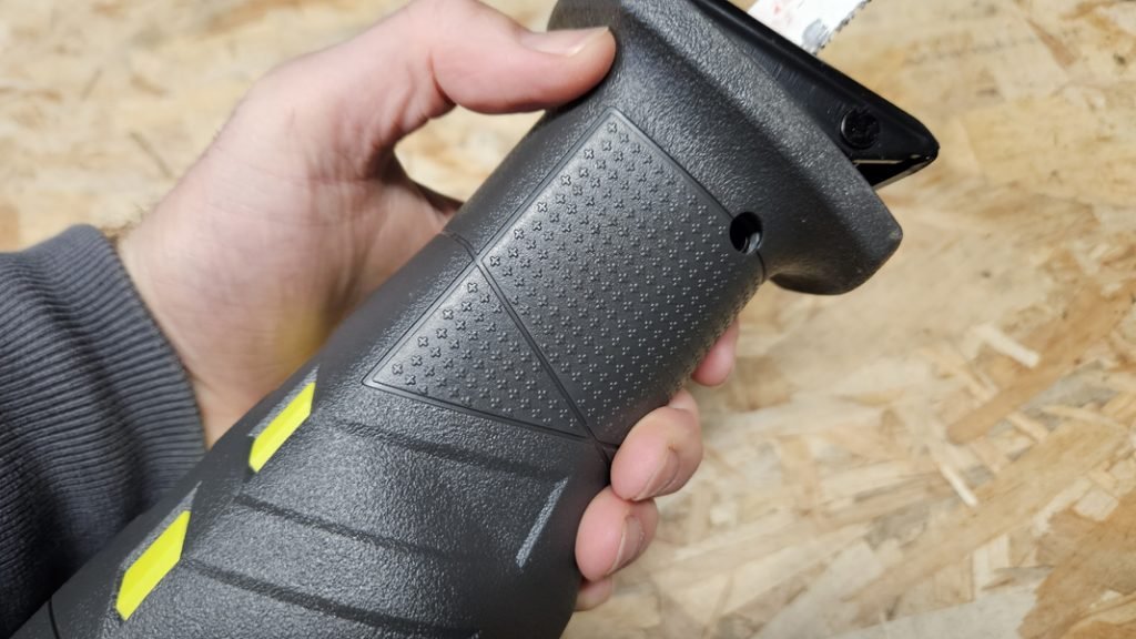 Avec un poids de 2,4 kg sans batterie, la scie sabre Ryobi R18RS-0 n’est pas la plus légère du marché. Elle s’utilise de préférence à deux mains, ce qui améliore la maîtrise et réduit la fatigue lors des coupes longues. La poignée principale est recouverte d’un grip caoutchouté efficace, et la gâchette réagit bien.