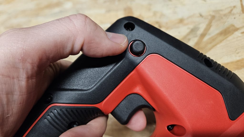 Le changement de lame est sans outil, il suffit en effet de soulever d’abord le capot frontal, avant de tirer sur la bague de blocage. Il ne reste ensuite plus qu’à insérer la lame jusqu’en butée, avant de relâcher pour un verrouillage immédiat. Pour retirer la lame, on actionne de nouveau la bague, la lame est éjectée proprement. Le levier est un peu court mais le mécanisme reste fiable et rapide. Comme toujours, je vous conseille de retirer la batterie avant toute manipulation.