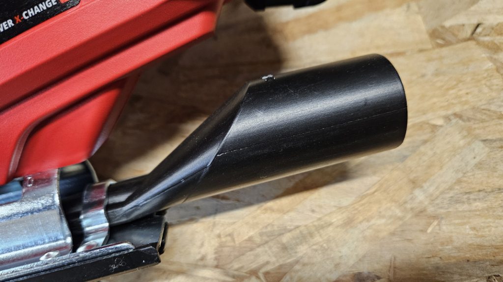 La TC-JS 18 Li n’intègre pas de soufflerie, mais en contrepartie, un adaptateur permet de brancher un aspirateur de chantier afin d’évacuer efficacement les résidus au plus près de la coupe. Un pare-éclats transparent se clipse à l’avant pour mieux voir le trait et limiter les éclats sur les surfaces fragiles.