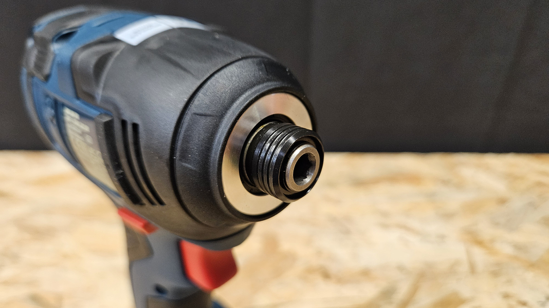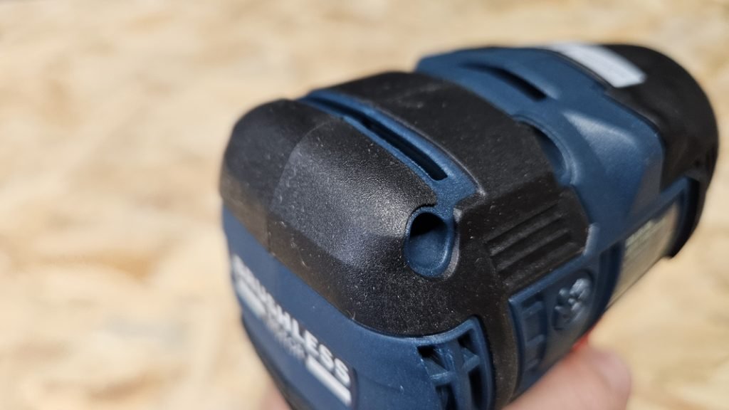 Cette visseuse, comme toutes les autres, est équipée d’un porte embout hexagonal ¼’’ à bague de verrouillage. Le changement est rapide, puisqu’il suffit de tirer sur la bague pour insérer ou retirer un embout. Pour une fixation optimale, mieux vaut utiliser des embouts de vissage avec encoche, qui tiennent parfaitement même sous forte contrainte.