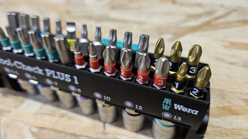 • 28 embouts au total, avec les empreintes courantes (plats, PZ/PH, Torx, Torx percés et 6 Pans). Wera a ajouté des bagues colorées pour identifier d’un coup d’œil le type et la taille.