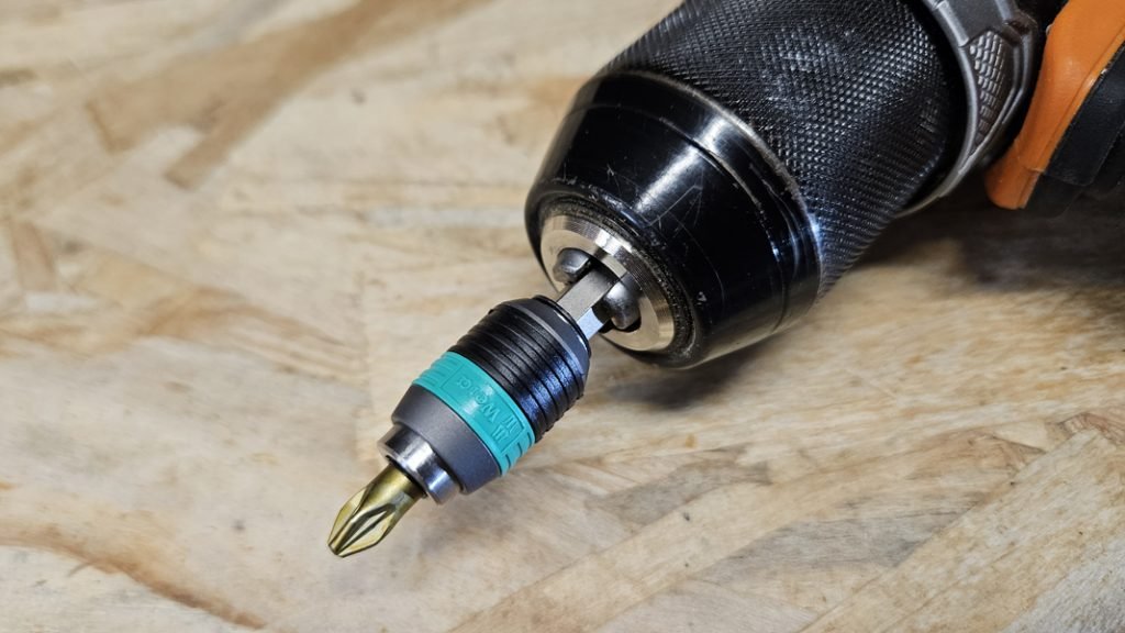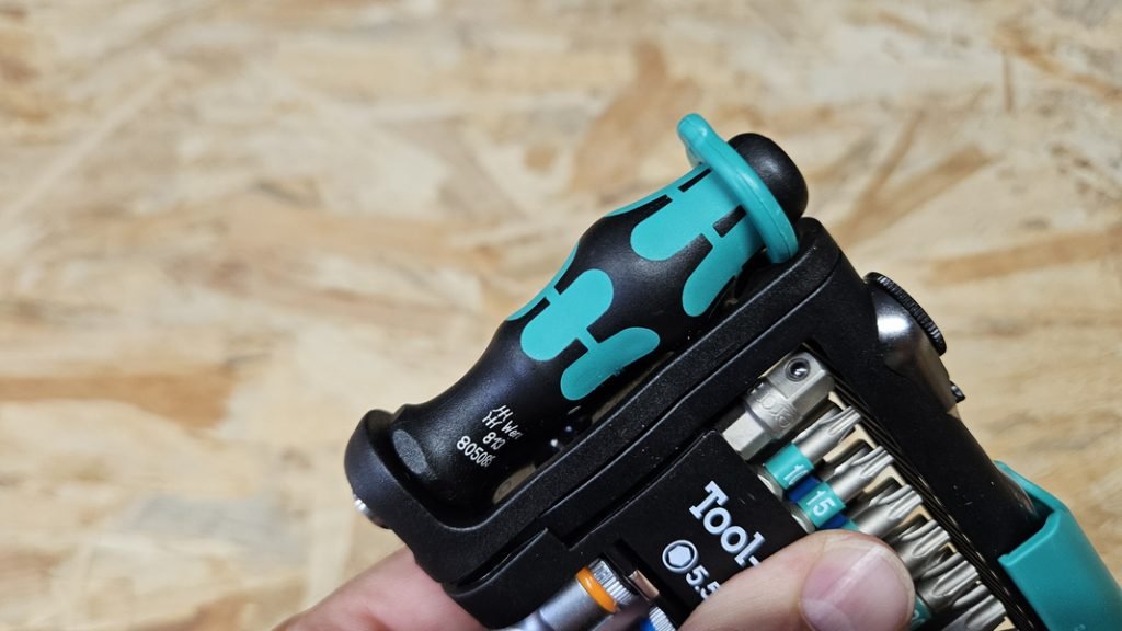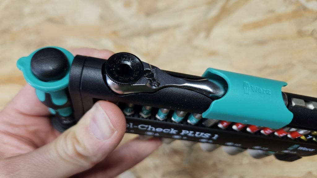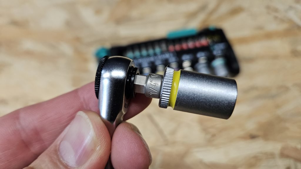 Le mini tournevis passe là où aucun manche standard ne passe, il est parfait pour l’assemblage ou le réglage, mais il ne faut pas lui demander un couple élevé. La clé à cliquet est la star du coffret, en tout cas c’est mon avis, elle est robuste, précise, et permet d’utiliser aussi bien les embouts que les douilles via l’adaptateur. Le porte embout à bague sécurise l’embout sur la visseuse et évite les “décrochages” au mauvais moment.