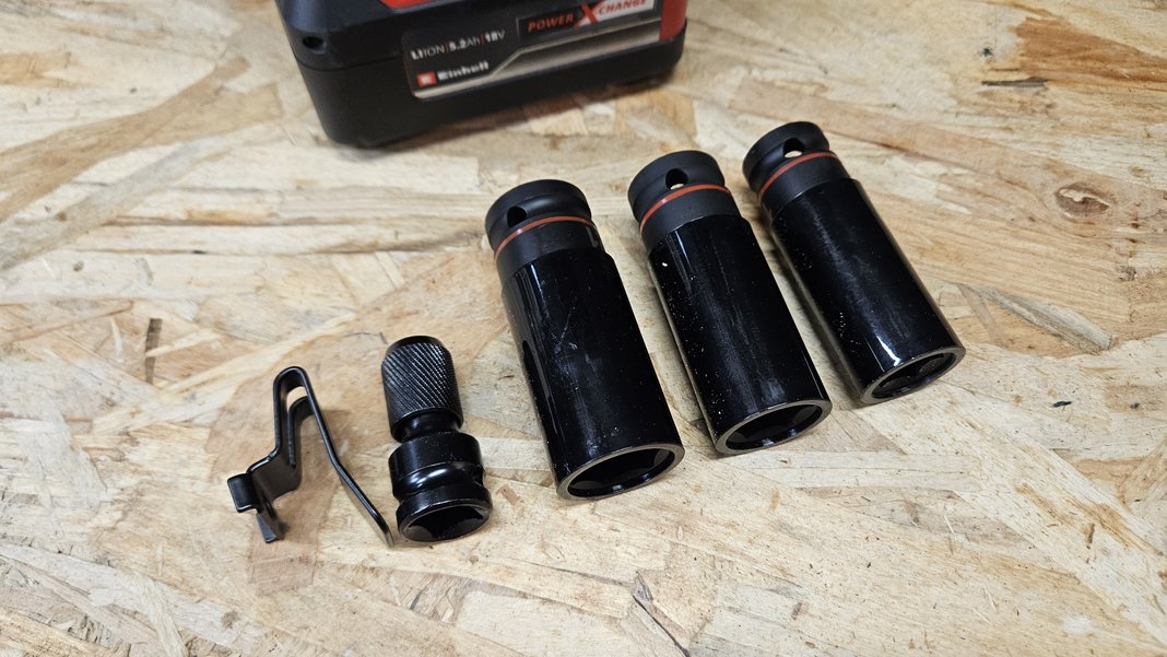 Cette boulonneuse est vendue la plupart du temps sans batterie ni chargeur, mais elle est livrée avec trois douilles de tailles courantes (M10, M12 et M14), un adaptateur pour embouts de vissage, ainsi qu’un clip ceinture. Ce petit ensemble permet de l’utiliser immédiatement si vous possédez déjà une batterie Einhell, sans avoir à investir dans des accessoires supplémentaires.